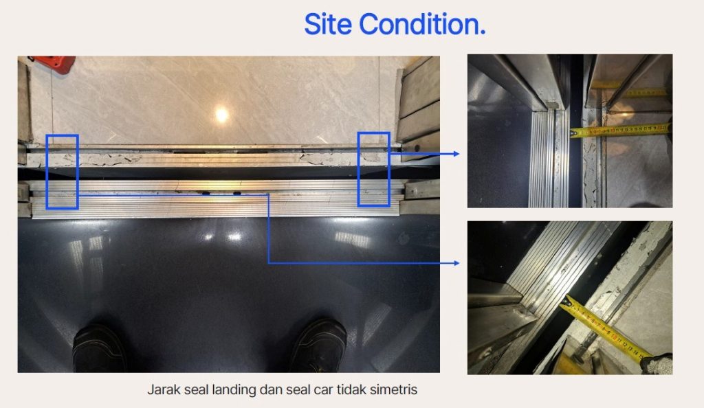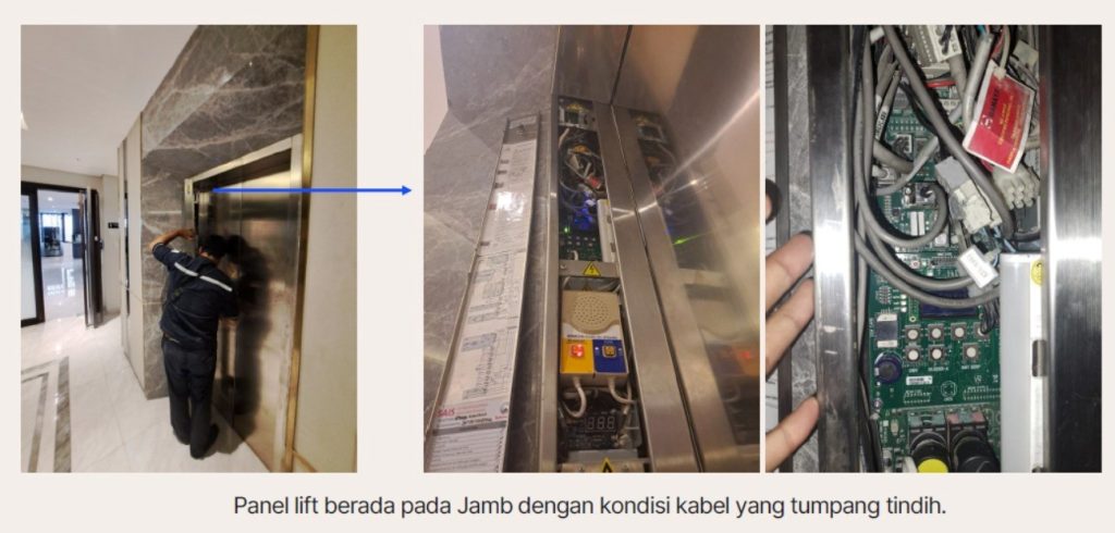 Beberapa temuan lain juga ditemukan selama inspeksi, seperti seal car dan door bottom guide (DBG) yang tidak sejajar, yang dapat mengganggu proses buka–tutup pintu lift. Selain itu, penataan kabel yang tidak rapi berpotensi meningkatkan risiko korsleting serta menyulitkan proses perawatan. Tim inspeksi juga menemukan genangan air di pit lift, yang dapat menyebabkan korosi pada komponen mekanis dan kerusakan pada peralatan listrik.